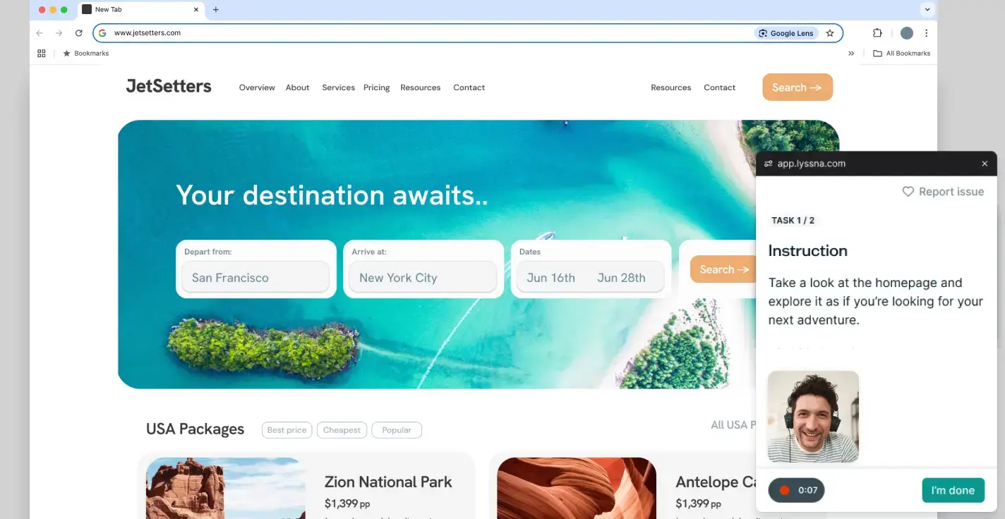Define tasks, track completion time, and gather additional context with follow-up questions. Picture-in-picture instructions ensure a smooth testing experience for participants.