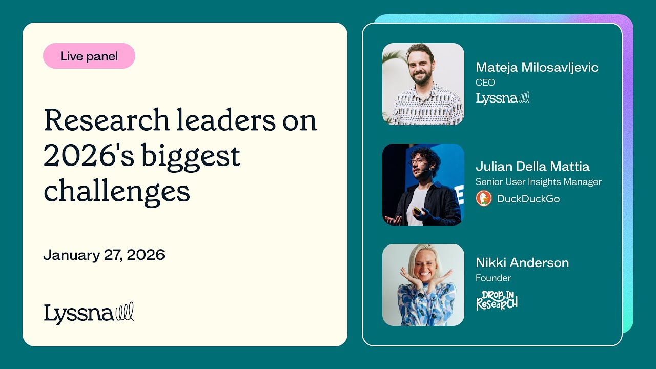 We brought together Julian Della Mattia (Senior User Insights Manager at DuckDuckGo) and Nikki Anderson (Founder of Drop In Research) with Lyssna CEO Mateja Milosavljevic to explore the biggest issues research practitioners are tackling right now – and the practical approaches they're testing to solve them.